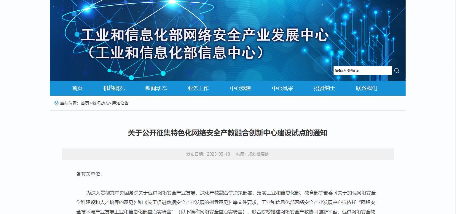 5月18日,工業(yè)和信息化部網(wǎng)絡(luò)安全產(chǎn)業(yè)發(fā)展中心發(fā)布關(guān)于公開征集特色化網(wǎng)絡(luò)安全產(chǎn)教融合創(chuàng)新中心建設(shè)試點的通知,首批擬征集30所有基礎(chǔ)、有意愿、有能力、有特色的院校參與網(wǎng)絡(luò)安全產(chǎn)教融合創(chuàng)新中心試點建設(shè),形成可復(fù)制、能推廣、有示范的經(jīng)驗做法。