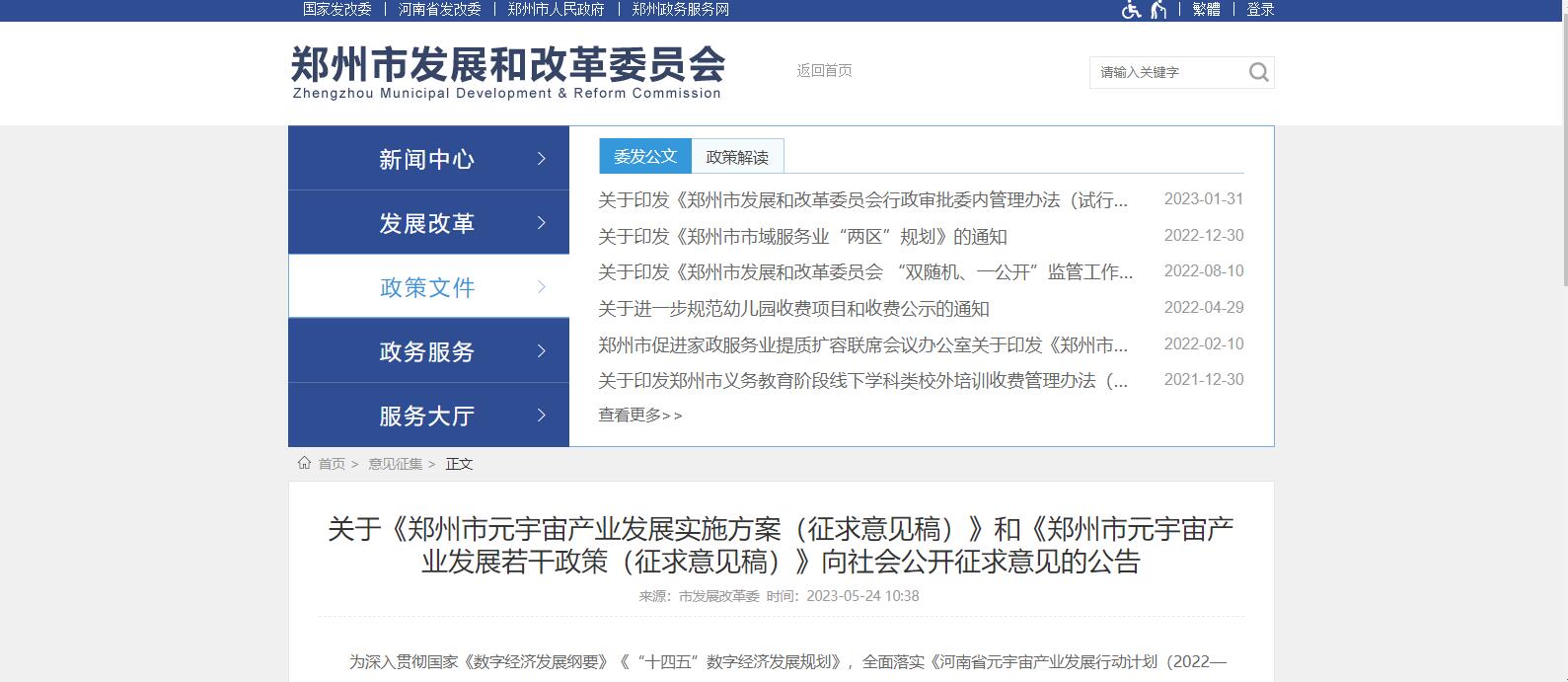 為加快構(gòu)建鄭州特色元宇宙產(chǎn)業(yè)生態(tài)體系,搶占未來產(chǎn)業(yè)制高點(diǎn),帶動(dòng)全市數(shù)字經(jīng)濟(jì)彎道超車、換道領(lǐng)跑,培育新的經(jīng)濟(jì)增長點(diǎn)。5月24日,鄭州發(fā)改委網(wǎng)站發(fā)布《鄭州市元宇宙產(chǎn)業(yè)發(fā)展實(shí)施方案(征求意見稿)》(以下簡稱《方案》)和《鄭州市元宇宙產(chǎn)業(yè)發(fā)展若干政策(征求意見稿)》(以下簡稱《若干政策》),并向社會(huì)公開征求意見。