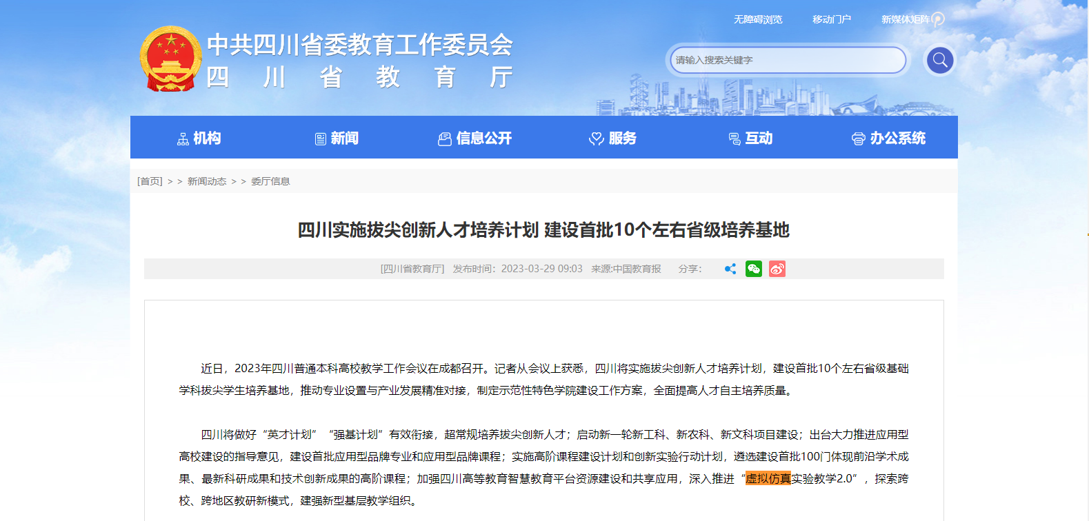近日,2023年四川普通本科高校教學(xué)工作會(huì)議在成都召開(kāi)。會(huì)上公布四川將實(shí)施拔尖創(chuàng)新人才培養(yǎng)計(jì)劃,建設(shè)首批10個(gè)左右省級(jí)基礎(chǔ)學(xué)科拔尖學(xué)生培養(yǎng)基地,推動(dòng)專業(yè)設(shè)置與產(chǎn)業(yè)發(fā)展精準(zhǔn)對(duì)接,制定示范性特色學(xué)院建設(shè)工作方案,全面提高人才自主培養(yǎng)質(zhì)量。